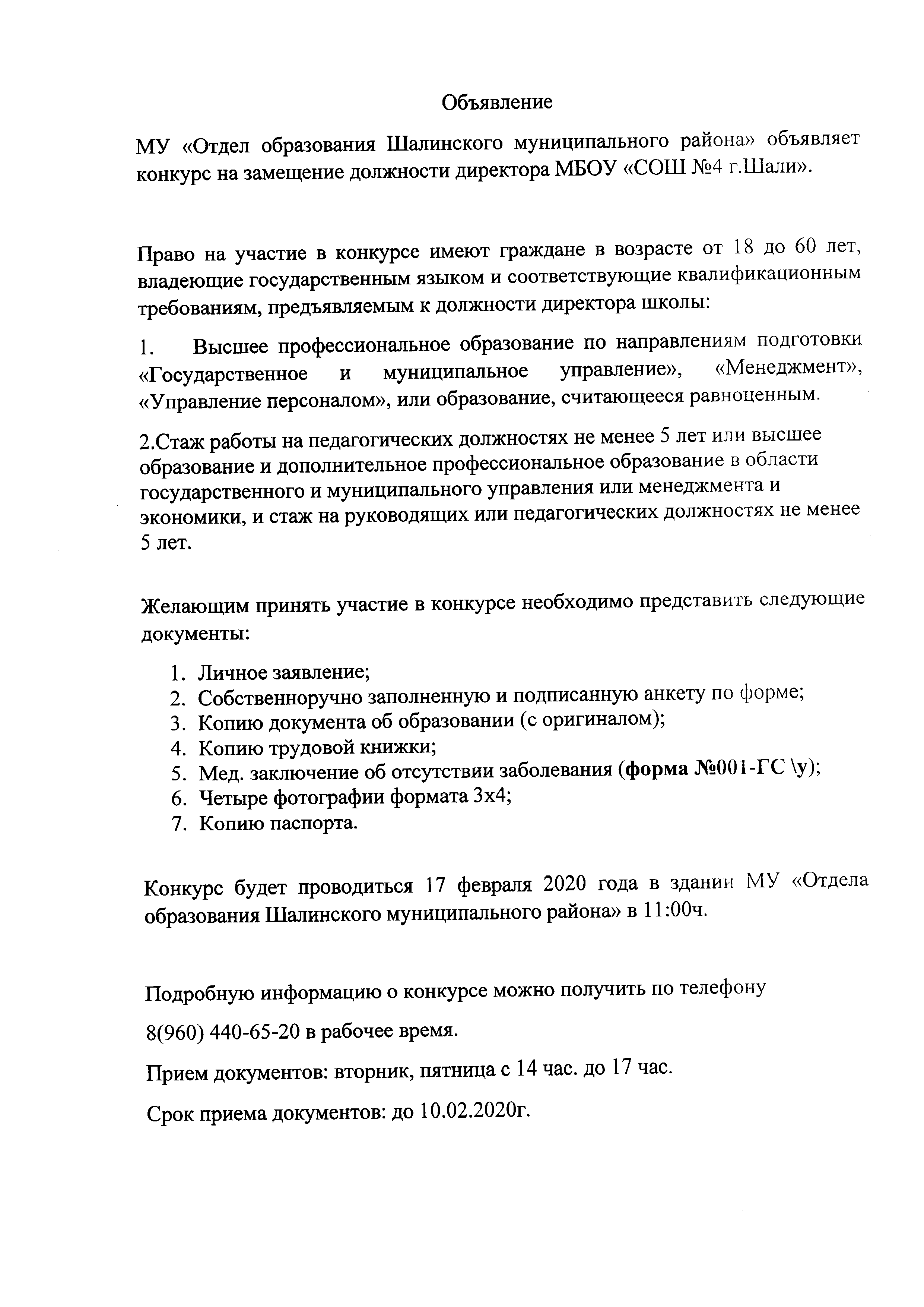 Объявление о проведении конкурса на замещение вакантной должности Руководителя МБОУ СОШ №4 г.Шали Скачать