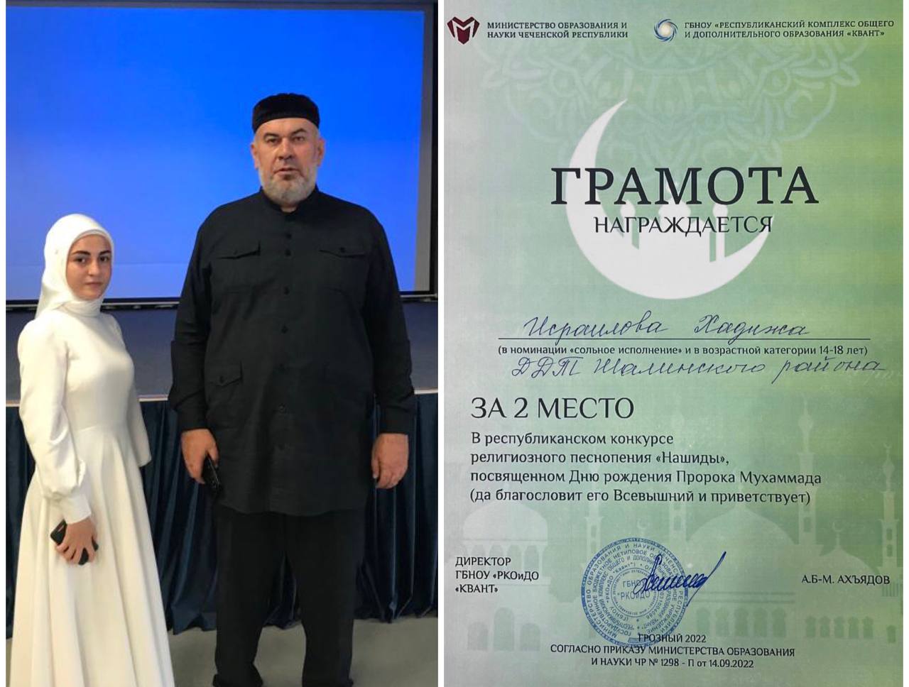 Участие в конкурсе приняла обучающаяся МБУ ДО «ДДТ Шалинского муниципального района» Исраилова Хадижа Хасановна, которая также являющейся ученицей 9 «а» класса МБОУ СОШ «Терра нова». Исраилова Хадижа заняла почётное 2- ое место, с чем мы ее и поздравляем! Целью данного конкурса является: повышение религиозных знаний, ознакомление с уникальной историей Пророка Мухаммада (мир ему и благословение от Аллаха), формирование любви к религии и к Пророку Мухаммаду (мир ему и благословение от Аллаха), гордости за его духовное, культурное наследие, повышение мотивации детей к пониманию духовно-нравственных аспектов в жизни человека.
