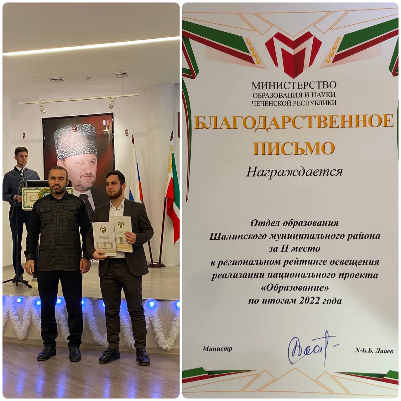 Отдел образования Шалинского муниципального района награждён благодарственным письмом Министерства образования и науки ЧР за почётное второе место в региональном рейтинге освещения реализации национального проекта «Образование» по итогам 2022 года. Благодарственным письмом был отмечен также специалист по защите информации отдела ИКТ «Отдела образования» Ааев Шейх-Мансур Алавдиевич за активное участие в работе по освещению реализации нацпроекта «Образование» по итогам 2022 года.