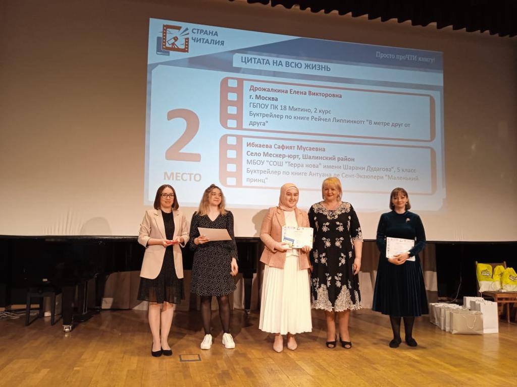 Друзья, у нас радостная весть! МБОУ "СОШ Терра Нова с.Мескер-Юрт", в лице наставников Ибкаевой Аминат и Адсаламовой Амины заняли второе и третье призовые места в Международном конкурсе «Страна Читалия» в номинациях «Цитата на всю жизнь» и «Книга на иностранном языке». Награждение состоялось в зале Российской Государственной детской библиотеки города Москвы. Поздравляем наших победителей и желаем дальнейших успехов!