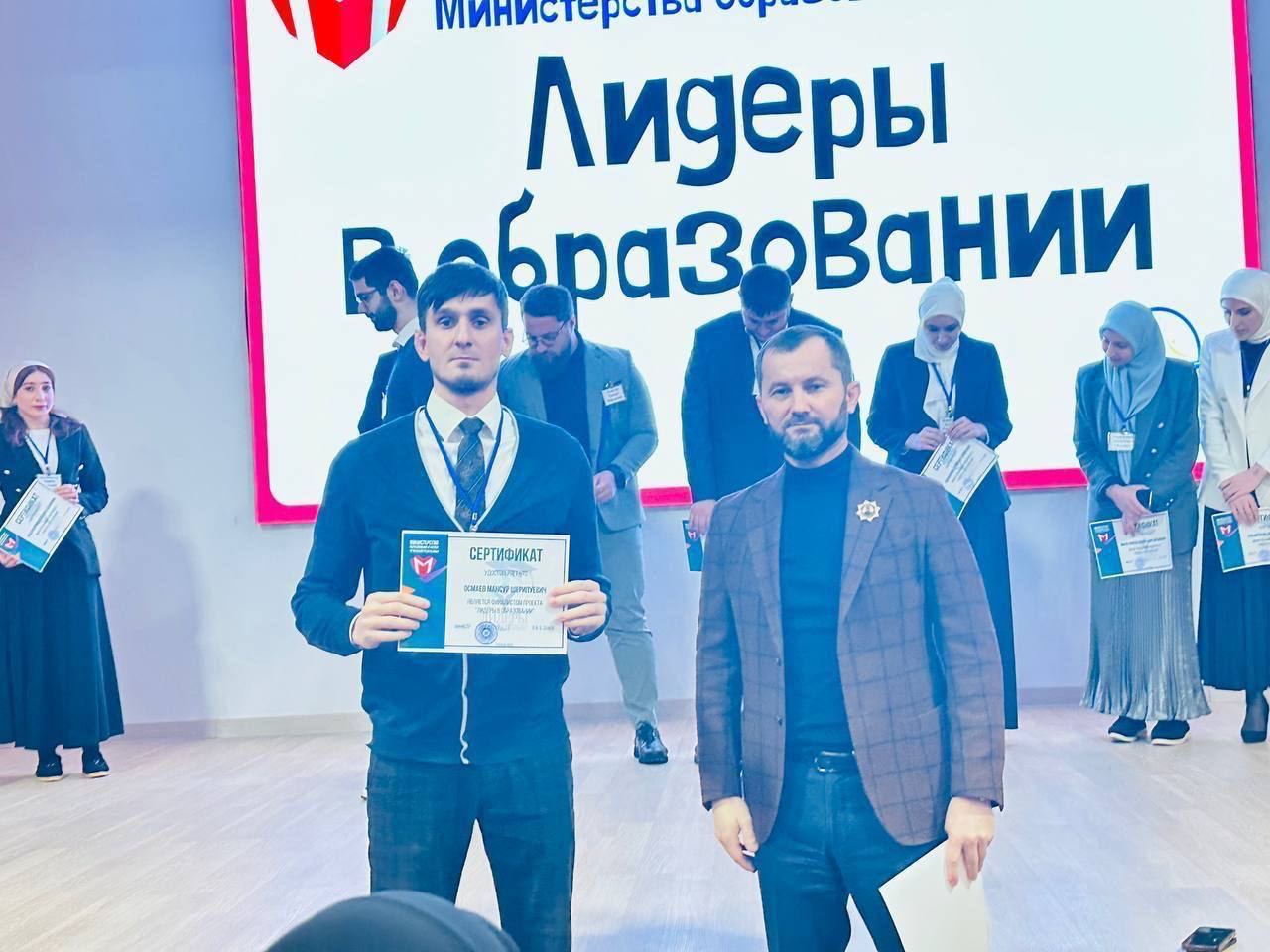 Региональный методист и учитель информатики МБОУ «СОШ «Мир знаний» с. Герменчук» Осмаев Мансур Шерипуевич стал финалистом Республиканского конкурса «Лидеры в образовании», где прошёл отбор для обучения по программе профессиональной переподготовки «Школа лидеров общего образования» в объеме 250 часов. Всего было подано 100 заявок, из них 66 участников прошли во второй конкурсный отборочный этап. По итогам второго отборочного этапа в финал вышли 32 участника. Проект «Лидеры в образовании» реализуется на основании приказа Минобрнауки ЧР от 29.01.202З 1425-п «Об утверждении Положения о конкурсном отборе слушателей» для обучения по программе профессионльной переподготовки. Дала т1аьхье беркате йойла!